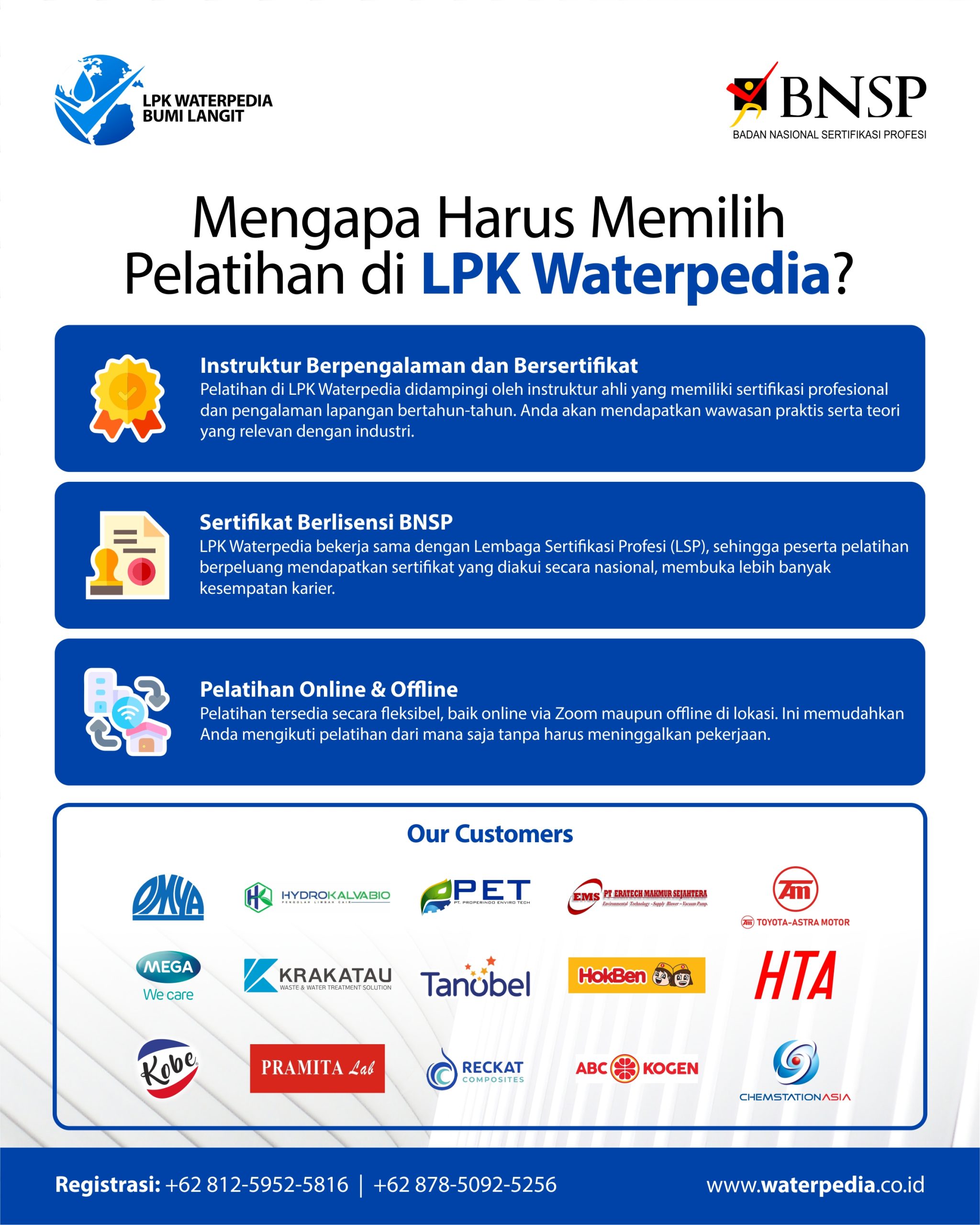 LPK Waterpedia Bumi Langit kembali mengadakan pelatihan bagi Anda yang ingin meningkatkan kompetensi sebagai: